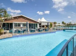 Apartments are privately owned but managed by the resort. Lagoon pool is huge and you can access from the balcony. Opposite is a large shopping centre with fast food and supermarkets. Only restaurant in close proximity is in the resort if you like pizza. Buses run front the door to Nelson Bay. We fly but would probably come by car next time.